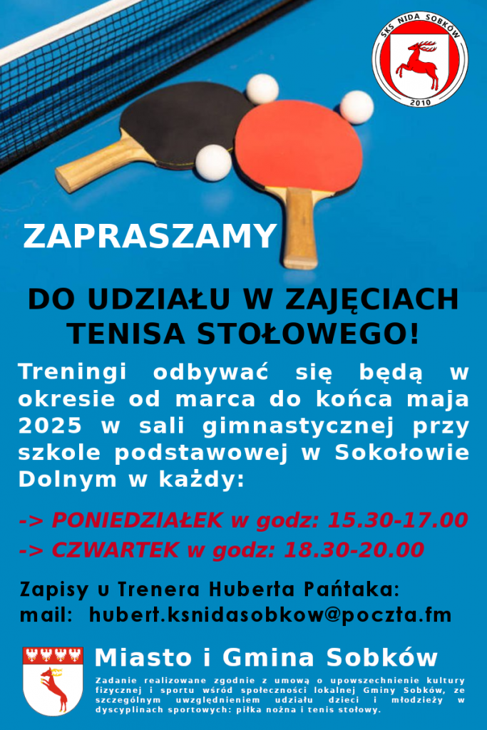 Od marca 2025 wznowiliśmy zajęcia z tenisa stołowego w naszym klubie. Treningi odbywać się będą dwa razy w tygodniu (poniedziałek i czwartek) w okresie od marca do końca maja 2025 w sali gimnastycznej przy szkole podstawowej w Sokołowie Dolnym. Udział w treningach mogą wziąć dzieci i młodzież z terenu gminy Sobków. Zapisy u Trenera Huberta Pańtaka pod mailem: hubert.ksnidasobkow@poczta.fm lub bezpośrednio przed zajęciami.